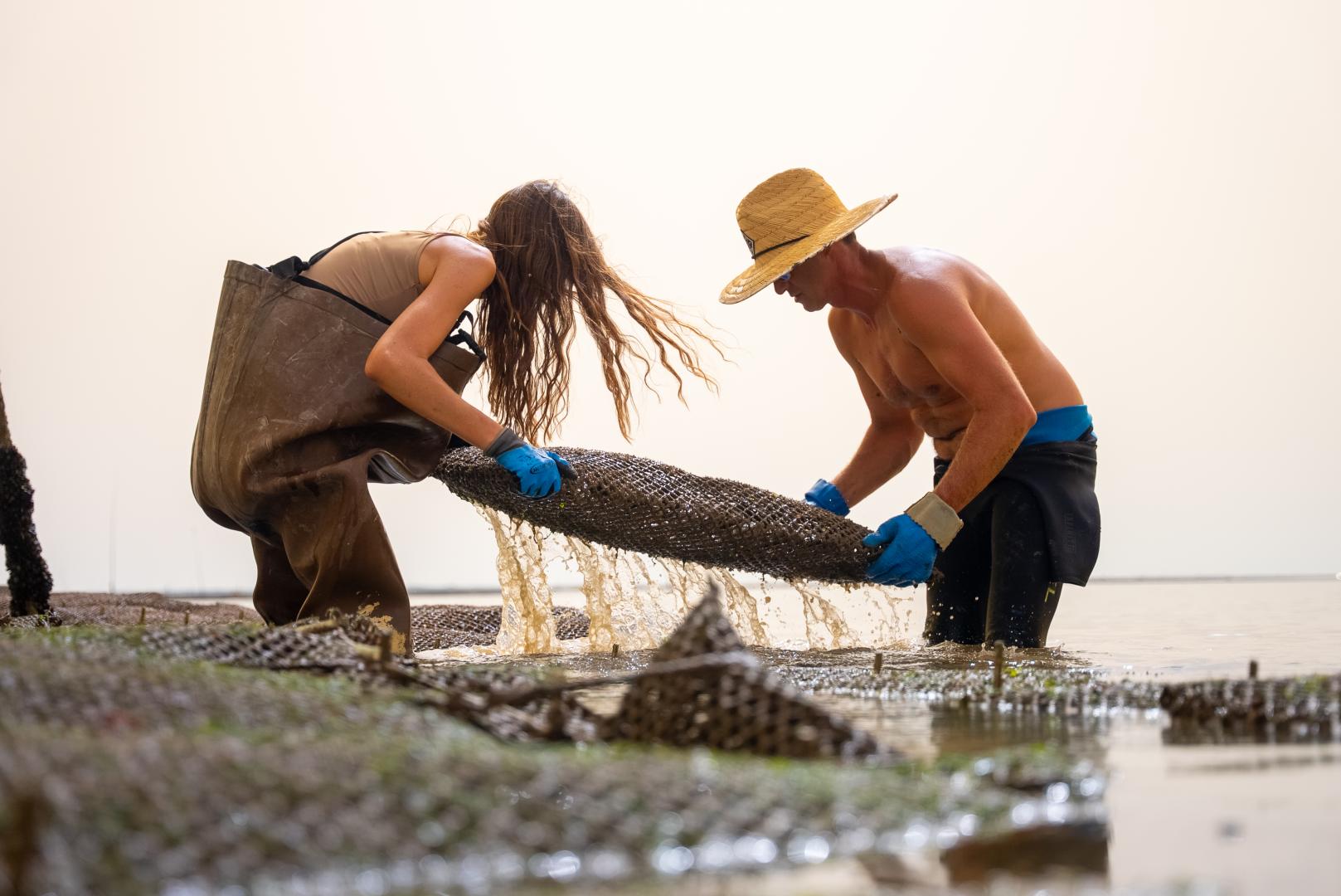 A continuación, podemos pasar a la segunda etapa, el desprendimiento, que consiste en separar suavemente las ostras entre sí. A continuación se pueden devolver al mar, en bolsas colocadas sobre mesas. Durante casi dos años, las ostras se alimentan de plancton y crecen bajo la supervisión del ostricultor. Durante este periodo, las bolsas deben manipularse casi cuarenta veces, dependiendo de las mareas y las corrientes. El ostricultor tiene que cuidar de sus criaderos todos los días. Es un trabajo duro, pero muy preciso.